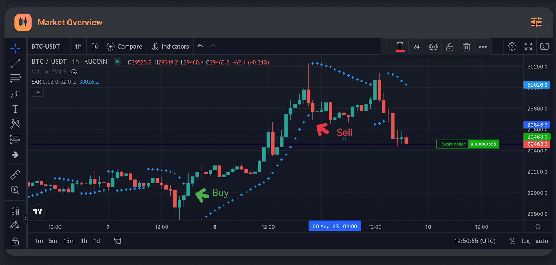 A double parabolic SAR technique employs two periods. A higher timeframe first indicates the trend direction based on the direction of the parabolic SAR. After determining the long-term trend direction, trades are entered in a shorter timeframe but only in the direction of the longer-term trend. The hourly chart of BTC (image below), with a parabolic SAR connected, reveals that the price is currently in an uptrend. As of August 1, the price is above the indication in the image below.