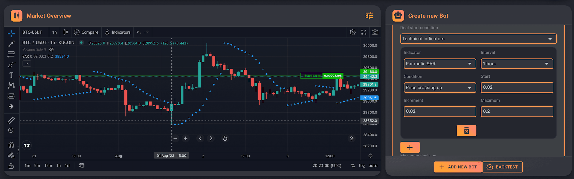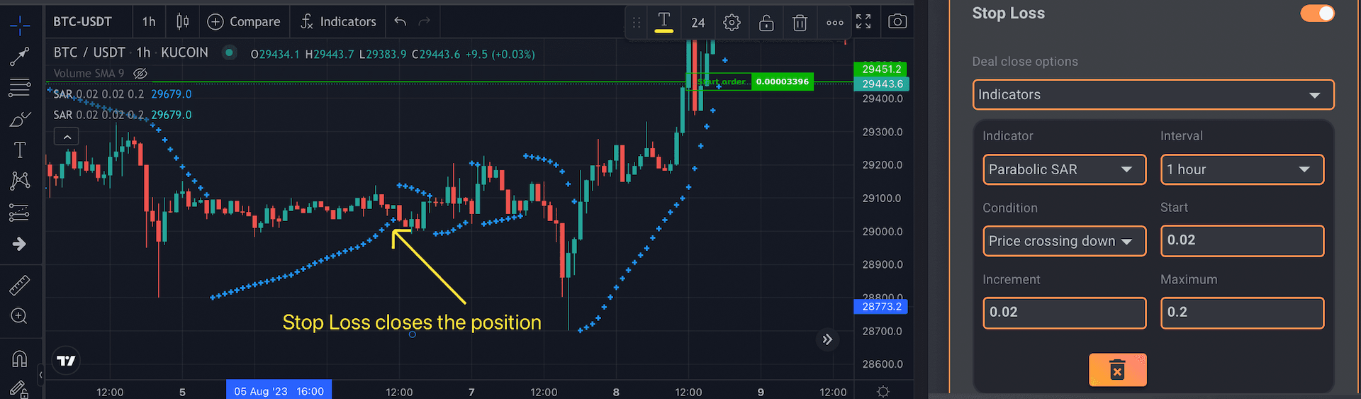 To use parabolic SAR to set stop-loss levels, place your stop-loss order at the level of the most recent dot on the opposite side of the trend. If you are long, for example, you can set your stop-loss order at the level of the most recent dot below the price. This can be easily done using the SL feature in Gainium. See the image below.